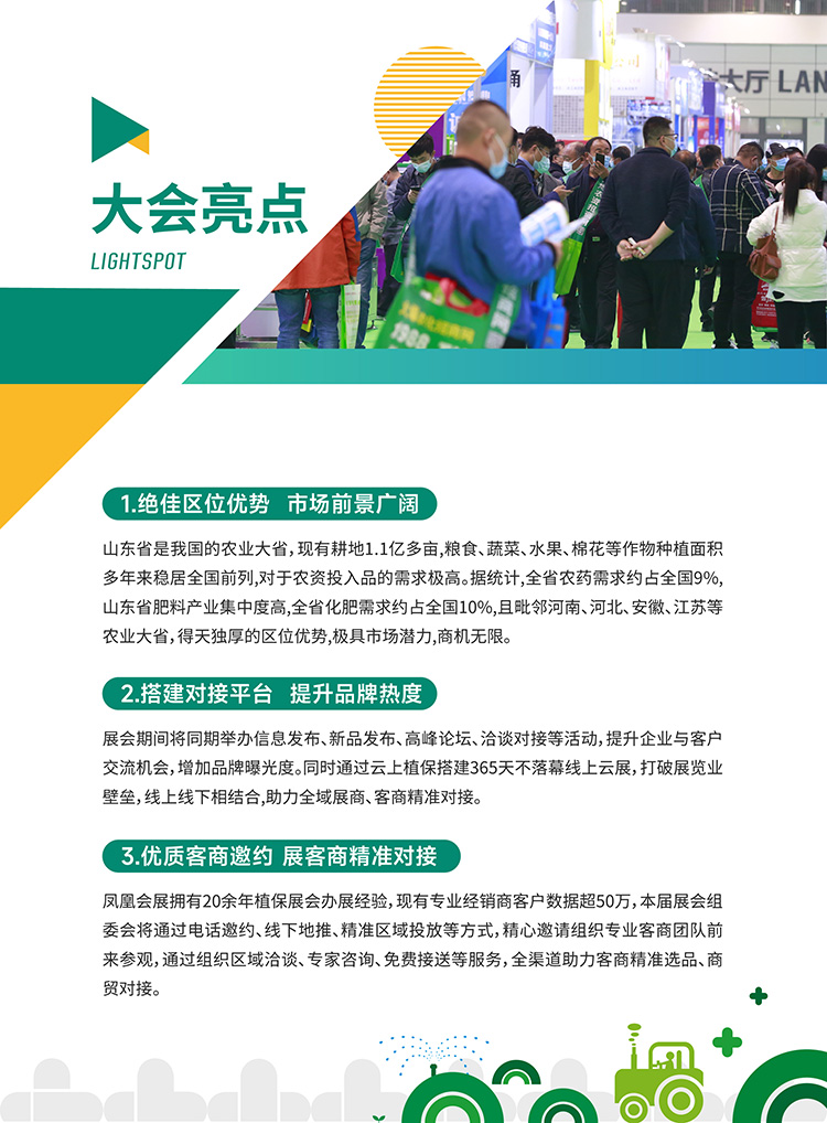 为贯彻落实2023年中央一号文件《中共中央 关于做好2023年全面推进乡村振兴重点工作的意见》,大会以【山东植保会】、【山东新型肥料展】为基础,从绿色农药、新型肥料、先进装备、农业科技等,打造现代化农业科技产业链交流平台,助力全面推进乡村振兴,加快农业农村现代化发展。